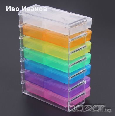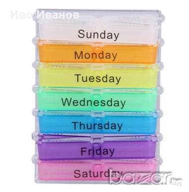 Нов органайзер за стриктно спазване приемане на хапчета . Контейнера съдържа 7 чекмеджета –надписани от понеделник до неделя. Всяко чекмедже има 4 отделения – сутрин,обяд, следобяд, вечер – там се поставят необходимите хапчета. Всяко чекмедже в контейнера има собствен цвят и обозначителен надпис.Контейнера, чекмеджетата и отделенията са от пластичен материал и имат правоъгълна форма с размери 105 х 75 х 45 mm – могат да се носят в джоба на сакото,ризата,чантичка.