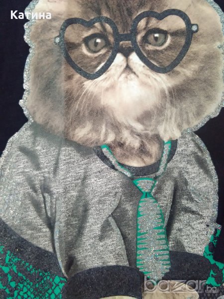Блузка със сладък принт от много фино черно трико.Размер на етикета 14.Отговаря на 11-13 год.Причислила съм я към състояние"използвано",но всъщност е обличана само веднъж.Без следи от употреба.