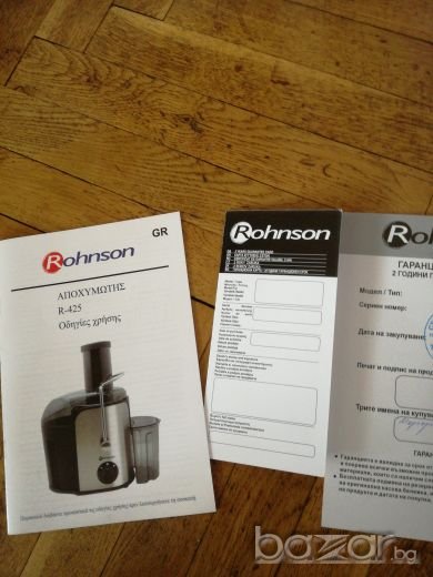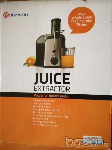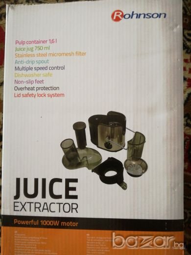 Използвана е само 2—3пъти,като нова е.Закупена от технополис за 109лв.на промоция.Марка Rohnson.Мощност на мотора 1000вата,защита от прегряване,филтър от нераждаема стомана с фино пресоване,крачета устойчиви на хлъзгане.Много добра и качествена.Лесна за използване и подръжка.Подарък четчица за по- лесно почистване на цедката.С каничка/чашка/ за готовият сок има и контейнерче за отпадаците.