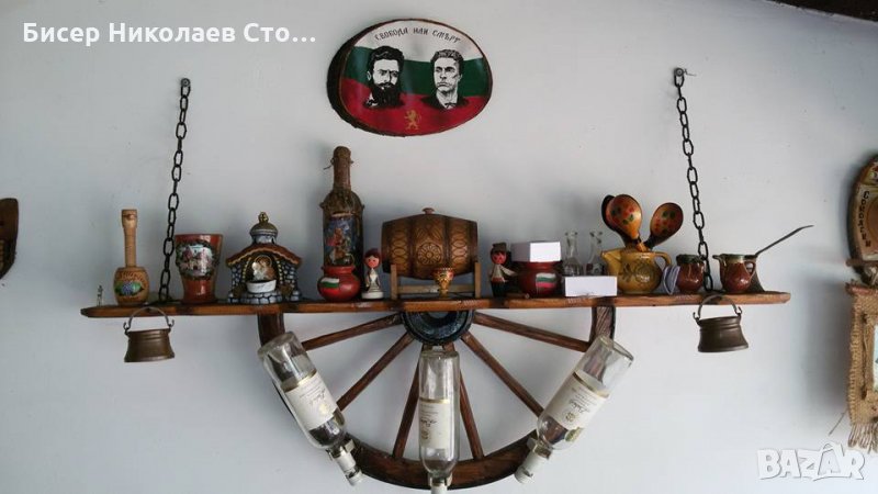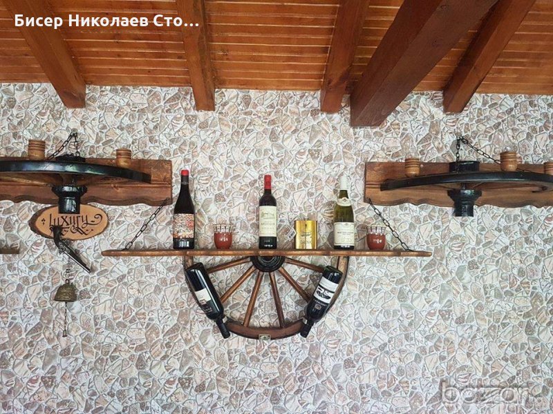 Изработвам рафтове за вино(сувенири,цветя и др)от автентични колела на каруци!Дължина 120 см,ширина на дъската 20 см.Може да бъде изработен с лед осветление или с дървени чашки-3 бр-129лв!