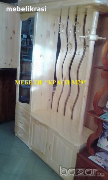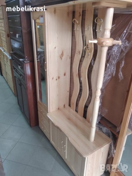 Порт-манто Лукс- изработено изцяло от естествено дърво /Бор/- в натурален цвят. С 3 чекмеджета под огледалната врата. Пространството в гардеробчето е разделено на три прегради за кутии с обувки. Шкафът за обувки е с 1 рафт който разделя пространството на две отделения.