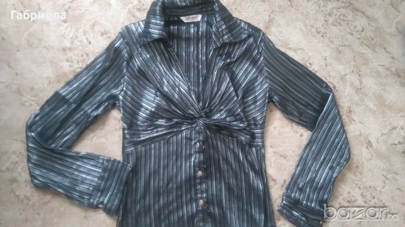 Черната риза на сребърни райета е за дами размер С/М, много стилна.