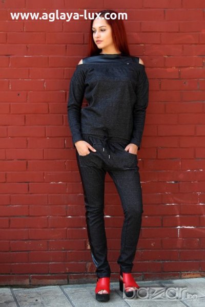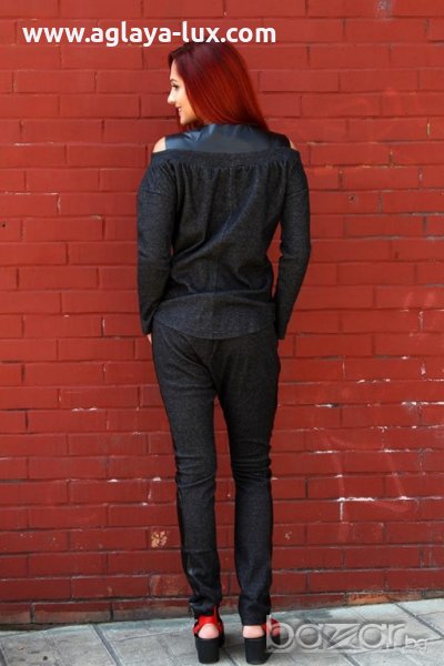 дамски комплект тъмно сив трико в комбинация с кожа,98% памук 2% еластан,размери-S(гр.об-84-88;талия-64-68;ханш-90-94);-M(гр.об-88-92;талия-68-72;ханш-94-98);-L(гр.об-96-100;талия-76-80;ханш-100-104);-XL(гр.об-102-108; талия-80-86;ханш-104-110;)