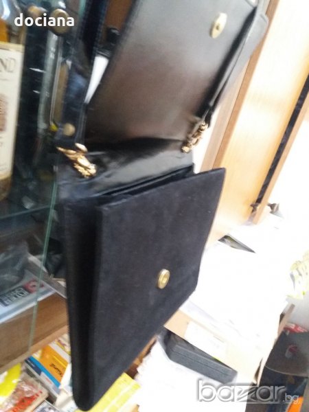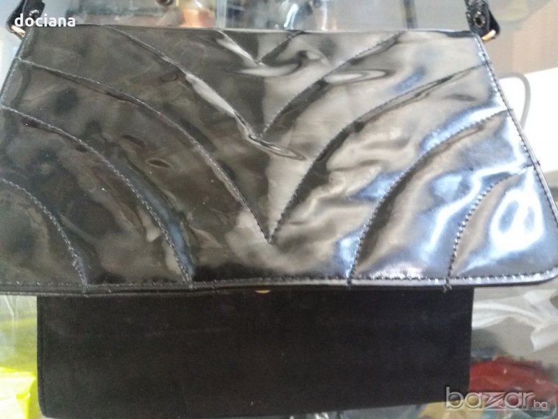 Чантата е нова в черен кадифен цвят и с лачено капаче отпред и с по дълга дръжка размери 19 на 22см може да се носи и в рака без дръжка чанта клъч