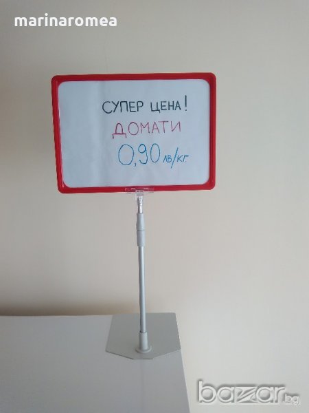Марина Ромеа ЕООД продава елегантни и мултифункционални информационни табели с правоъгълна основа, регулируема височина и лесна смяна на рамката - от вертикално в хоризонтално положение. Използва се за стимулиране на продажбите в точката на предлагане. Позволява многократна и бърза подмяна на информацията. Комплектът се предлага с рамка за лист А4, изработена от висококачествена пластмаса в червен цвят.