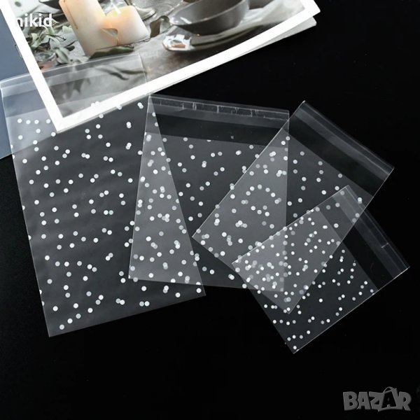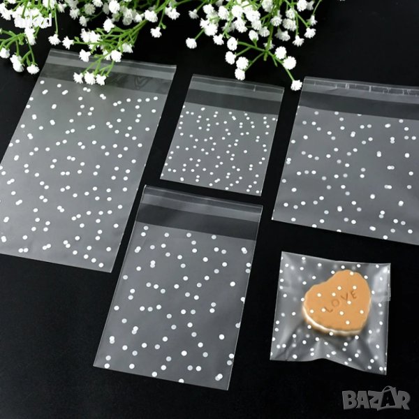 50 бр бели точки прозрачни опаковъчни пликчета торбички за дребни сладки ръчна изработка коледни → Обява 20618827