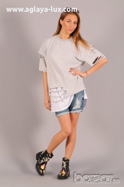 уникална дамска туника от две части,дълъг бял потник и светло сива горна част с надпис на гърба и разкъсвания,трико 98% памук 2% еластан,размери-S(гр.об-84-88;талия-64-68;ханш-90-94);-M(гр.об-88-92;талия-68-72;ханш-94-98);-L(гр.об-96-100;талия-76-80;ханш-100-104);-XL(гр.об-102-108; талия-80-86;ханш-104-110;)