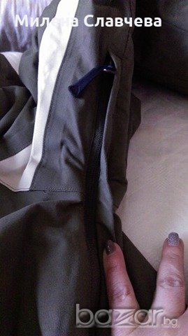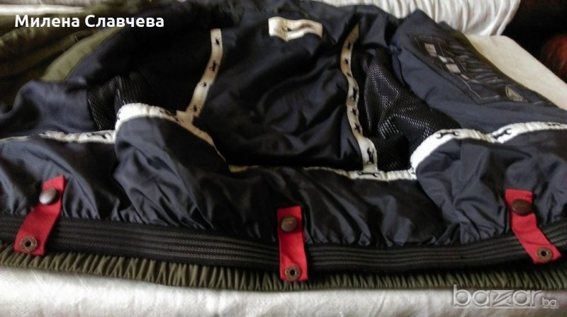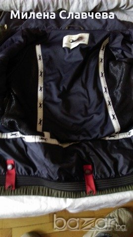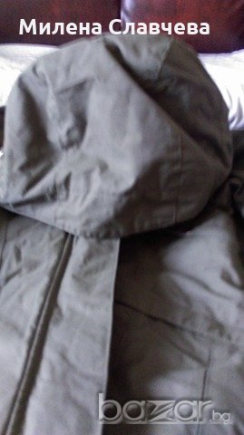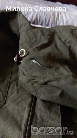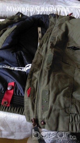 Зимно зелено яке №ХС,купено от Германия.Обличано 1път. Подходящо за 14-15год.момче.. Забележките са,че отвътре на якето и на качулката е изцапано с бяло,което се маха-показано е на снимките.Качулката се сваля.Искам да Ви предложа немско яке,предназначено за планина /прилагам снимка на вътрешен етикет на който е изобразено от какво предпазва/.Два вътрешни джоба с цип,подплатата се закопчава около кръста за предпазване на кръста,Три външни джоба с цип,сваляща се качулка и ципове под мишниците,които се разкопчават.Якето е било последно/мостра в магазина и забележката му е малки бели петънца ОТВЪТРЕ /последната снимка/.Цветът е войнишко зелено.Дълж.на ръкава 59см.,но е ориентировъчно,защото няма ръб на ръкава от който да премеря.Цяла дълж. на якето 59см.