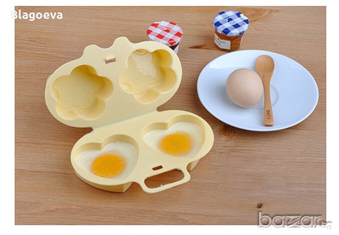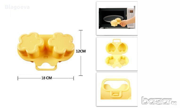 Това е форма за бързо приготвяне на омлети или яйца на очи в микровълнова печка – 2 бр. сърца и 2 бр. цветенца от двете страни на 1 форма. Отнема само 60 секунди за приготвяне.