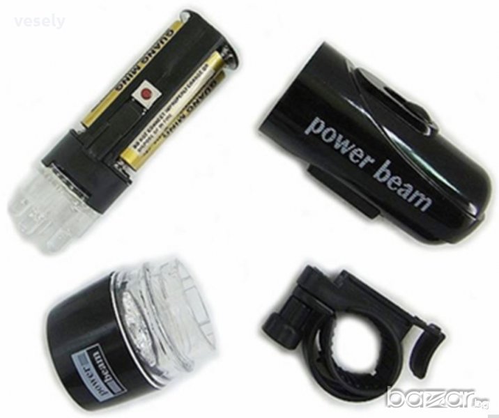 Преден фар за велосипед с 5 мощни светодиода-светлинен лъч до 8 м с два режима – постоянен и мигане.Продължително осветление от 4 батерии AAA (не влизат в комплекта). Монтира се на кормилото чрез разглобяем кронщейн.