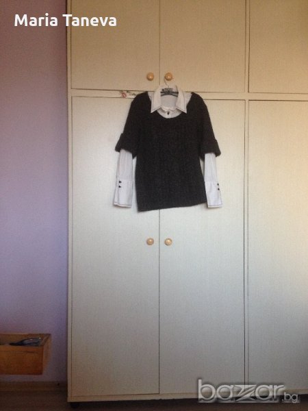 Дамски плетен блузон от прежда в черно-сив меланж.Предницата е с деколте около врата и декоративна плетка. Дължината на блузона е 66 см, разстоянието между раменете е 40 см.Ръкавите са 3/4 и са с дължина 28 см, завършват с маншет и копче - 8 см. Може да се носи с риза или поло блуза.