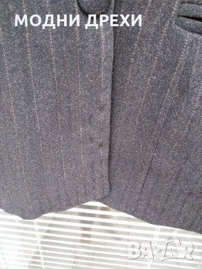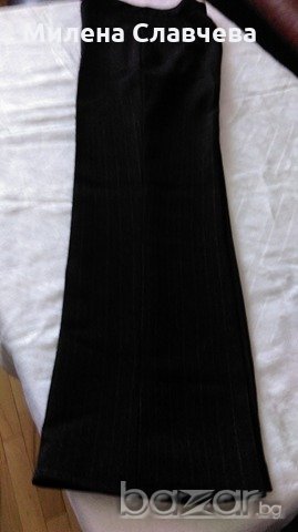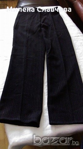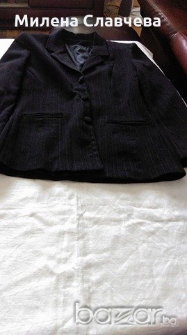 НОВ дамски костюм №40-българско производство.Костюмът само е премерен и с подкъсен панталон. Сакото от подмишница до подмишница при закопчано състояние е 46см./гръб между раменете 41см./дълж.панталон премерен отвътре 67см./талия панталон, едностранно 35см. Подходящ за дама с височина до 155см.