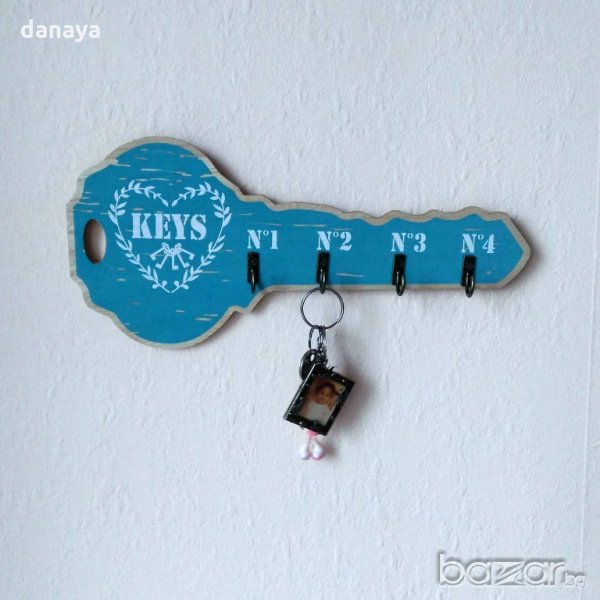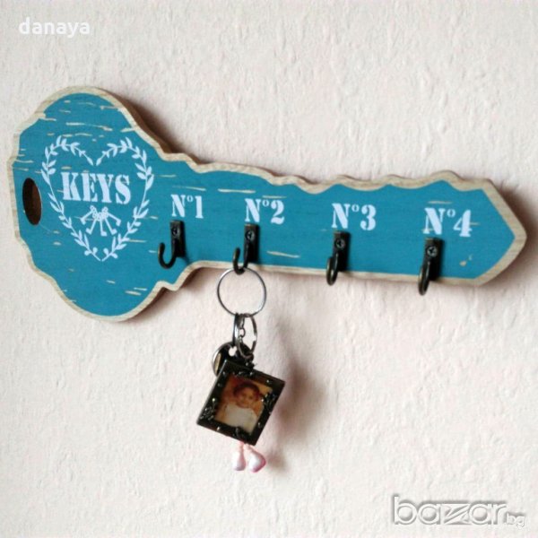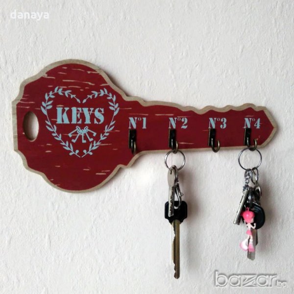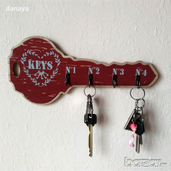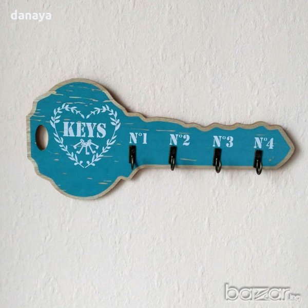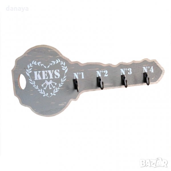 Декоративна поставка за ключове под формата на голям дървен ключ във винтидж стил. Към нея са прикрепени 4 куки за закачане, като всяка една от тях е номерирана. Красив и практичен декор за дома. С този органайзер за ключове лесно ще съхранявате всички ваши ключове и дребни аксесоари на удобно място.