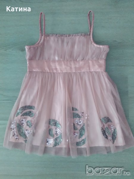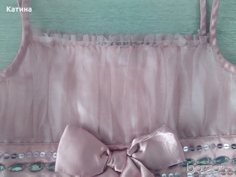 Страхотен топ в пепеляво розов цвят.Декориран с пайетки и кристалчета. Закопчаване с цип встрани,сатенена подплата.Подходящ за официални поводи.Размер на етикета 7-8 год.Обличан 1-2 пъти.Без следи от употреба.Към него- красива диадема в същия цвят,декорирана с кристалчета.