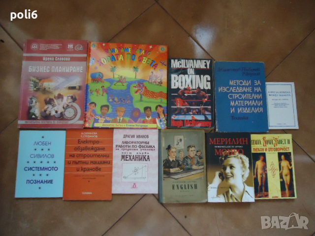 КНИГИ ПО 3€/бр : Железният юмрук на САЩ Пламен Григоров,Сборник упражнений по основньм разделам граматики английского язика ,За фасадом разведок Вадим Кассис,Христянския Созопол и мощите на св.Йоан Предтеча Божидар Димитров,Обща електротехника лабораторни упражнения за неелектро-технически специалности,Вочакване на варварите Кутси ,Последният череп на маркиз Дьо Сад Жак Шесекс,КНИГИ ПО 3.5€/бр: Курс по математика 5клас Сънрей,Пионери и Чавдарчета Михаил Лъкатник,Покани ме да вляза Йон Линдквист,100 сресвания преди сън Мелиса П.,Малката Мина Васил Попов,КНИГИ ПО 5€/бр: Бизнес планиране Ирена Славова ,Панорамен атлас хората по света Джонатан Литън,McILVANNEY on boxing,Благословена между женитъ Петър Дънов,Методи за изследване на строителните материали и изделия ,Системното познание Любен Сивилов,Електро обзавеждане на строителни и пътни машини и кранове Скринска,Лабораторни работи по физика Драгия Иванов,ENGLISH за 6клас 1957г на руски,Мерлин Монро поверително и лично Мишел Морган,Любов и отговорност Папа Йоан Павел,КНИГИ ПО 8€/бр: Земетресение Ваня Петкова ,Свидетел на исторята Иван Пехливанов ,Суровини и матеряли в хранително вкусовата промишленост Желязко Симов,КНИГИ ПО 10€/бр:Живот на прицел Светла Каролева, Градината на плевелите Павел Павлов ,/////лично предаване в Надежда 2 на Фантастико или метростанция Надежда