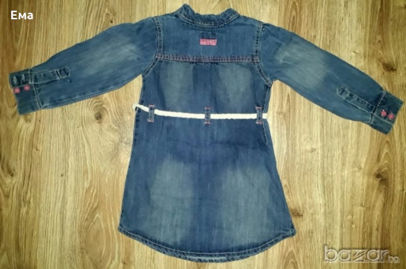 Дънковата рокличка Minoti е за 2-3 годишни сладуранки.Обличана е само 2 пъти.На третата снимка се вижда фабричния дефект, с който е закупена ( не го бях видяла ) и който не се личи кой знае колко... Няма други забележки. Роклята буквално си е като нова!!!