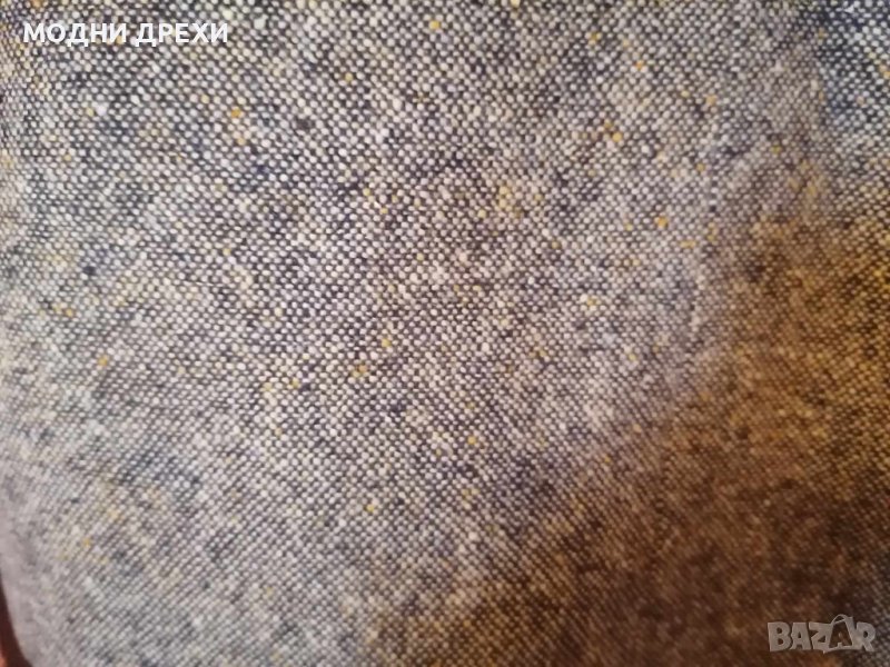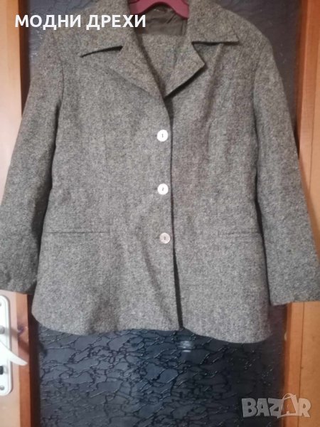 НОВ дамски пролетно-есенен костюм в пипитена маслено зелената гама № L.Сако и пола.Платът е вълнен,но тънък.Сакото и полата са с подплата.Полата е с цип отзад и с малка цепка: талия 37см./едностранно/ ,ханш 41см. и дължина 62см.