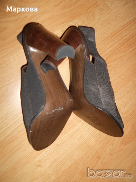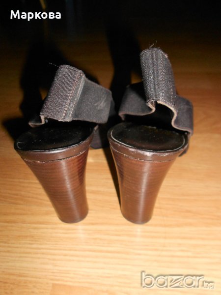 Нови Луксозни дамски сандали Stuart Weitzman. Тъмнокафяви. С ластик на петата. Висококачествен плат и естествена кожа. Не са обувани. Дължина на стелката 24 см. Дължина на тока 9 см. Донесени от САЩ.