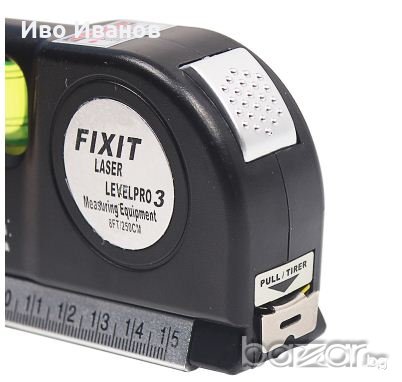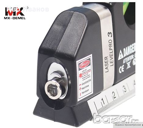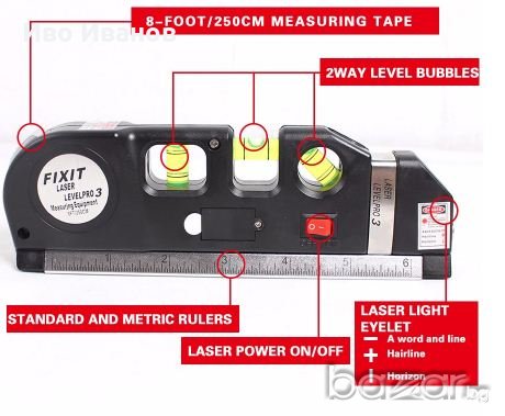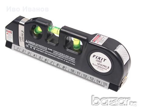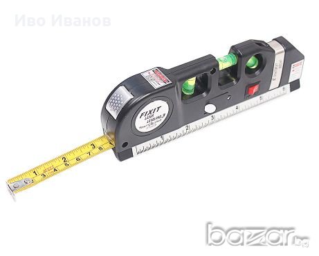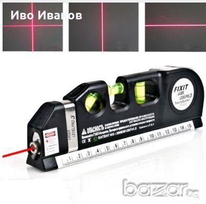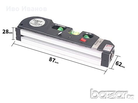 Нов мултифункционален лазерен нивелир с ролетка. Три вида лазер - хоризонтала, вертикала и пресечна точка. Вградена ролетка 250см. Малък лек и компактен. Лазер - 650nm. Мощност ≤1mW. В комплекта са включени 3бр. батерии AG 13. .Лазерен лъч с възможност за нивелиране,отвесиране и фиксиране на прав ъгъл- видим до 20 м в закрито помещение.Размери: 195 x 61 x 28mm.