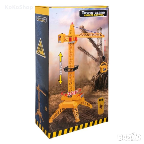 Кран с въртящо се тяло на 360°, кошница, която се повдига и спуска, и рамо, което прибира кошницата. С дистанционно управление, работещо с 2 батерии тип АА (не са включени).