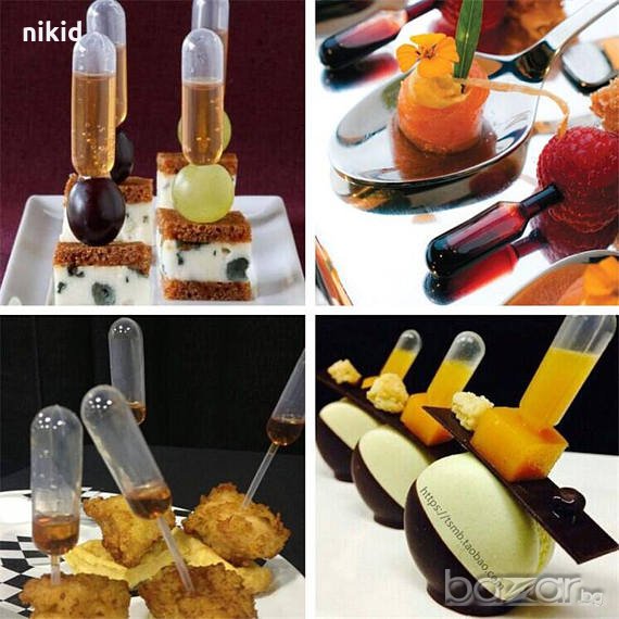 Класически пипети, идеални за сервиране на хапки, декоративни ястия и др. Направени от полиетилен, издръжлив на киселините от оцети и лимон, което ги прави перфектни за сервиране на кисели сосове, марини, дресинги и т.н.