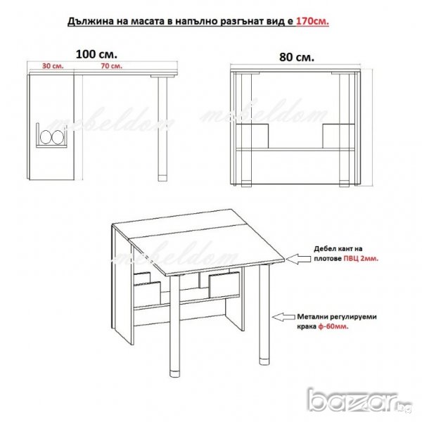 с едно крило: 100 / 80 / височина 75см. (виж схемата)