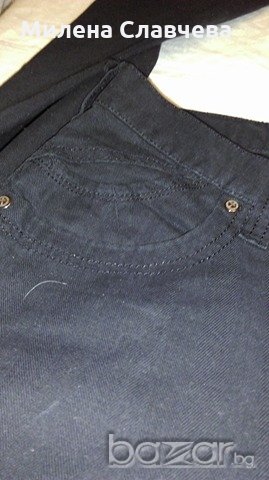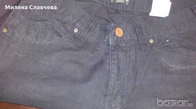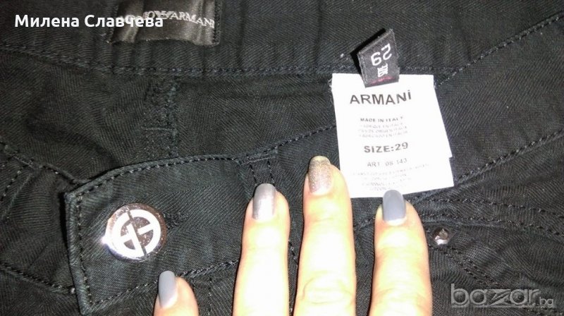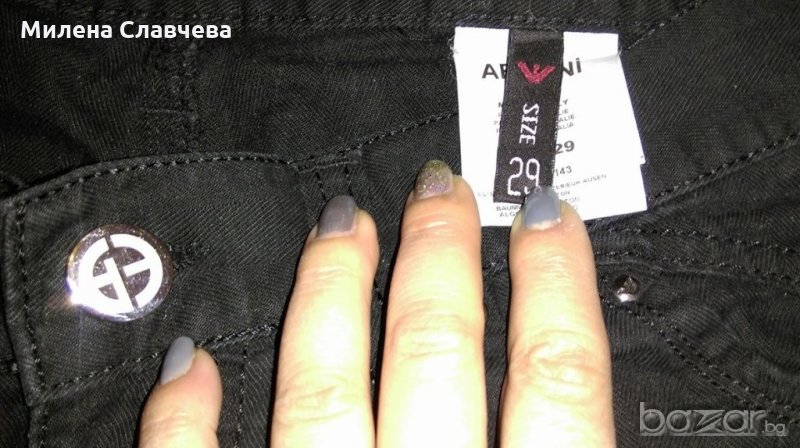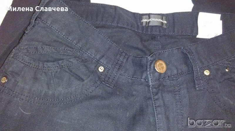 ОРИГИНАЛНИ МЪЖКИ ДЪНКИ /панталон/ EMPORIO ARMANI-черни.Обувани са 1 път,затова ги пиша нови.Никакви следи от употреба,оригиналната дължина /не са рязани/.Цената е ниска за марката,защото на левият джоб са пропуснати /не са паднали и няма дупки/ малките кабзи /показано е на последната снимка/,но не се забелязва,което сериозно се отразява на цената.Талията е 40см./премерена отпред/.
