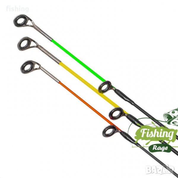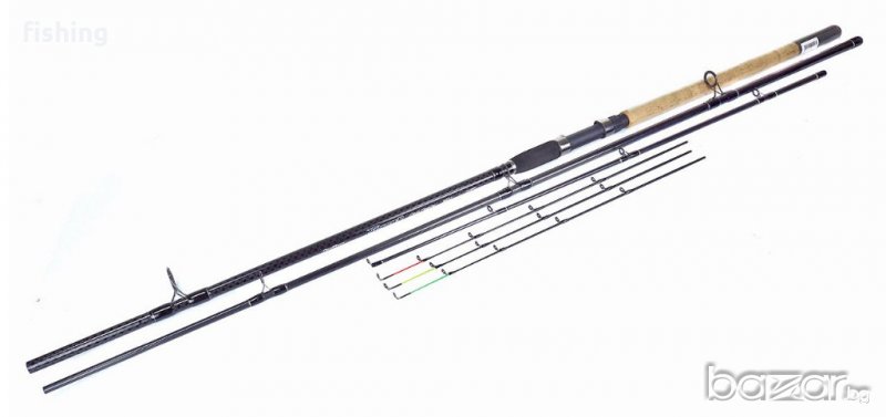 Фидер прът, изработен от IM8 карбон, оборудван с SiC водачи, ергономичен държач на макара и дръжка в комбинация от корк и EVA пяна материал.Оборудван е с три въръха с различна чувствителност.