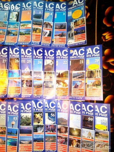 3 папки със списания "АТЛАС-светът във твоите ръце" са в перфектно състояние!Всички броеве са в наличност от 2 брой до последният 60 брой, с изключение на 1 и 43 брой,който липсват от тази колекция!Цената е за всичките 58 списания от тази колекция в 3 оригинални папки за съхранение! Цената е за всички в обявата!Може лек коментар на цената,за сериозни клиенти!Пращам по еконт с опция преглед и с 10% отстъпка за доставка до всяка точка на България!За повече инфо на лс или по телефона!