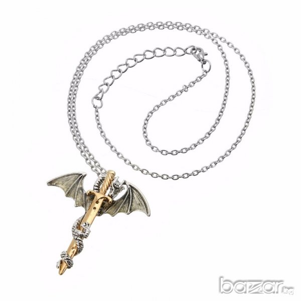 Game Of Thrones Медальон/колие светещ в тъмното(зелена или синя светлина) - Златен Меч обгърнат от Дракон. Отлично качество в оригинална опаковка - колекционерски!