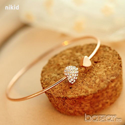Дамска твърда отворена гривна със сърца и камъчета златист цвят → Обява 20959326