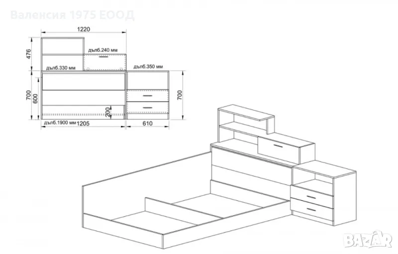 Легло: 120/ 190/ Н61см( височина на касата 20см);