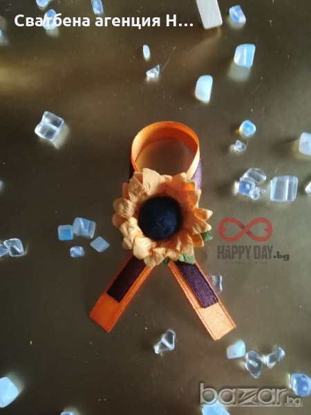 Изработена е от малко хартиено или слънчогледче от плат и декорирано със сатенени панделки, а на гърба има игла за по-лесно закачане.
