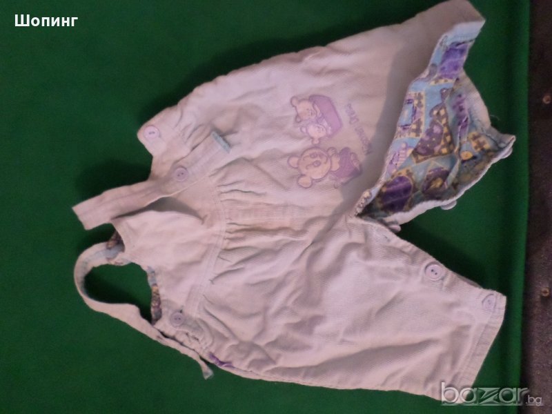 1. Джинсов гащеризон - памук, №68, подплатен. Закопчаване по краката и чатала с копчета. Апликация, Талия обиколка - 60 см.