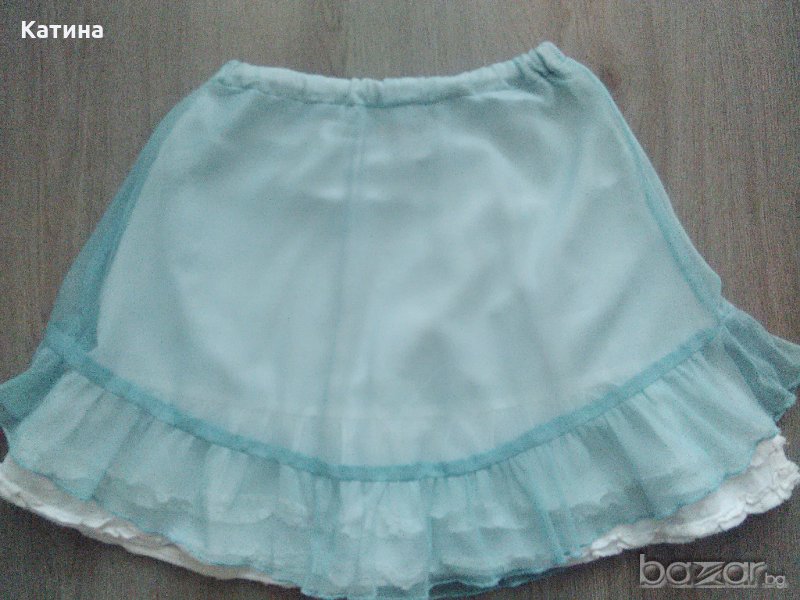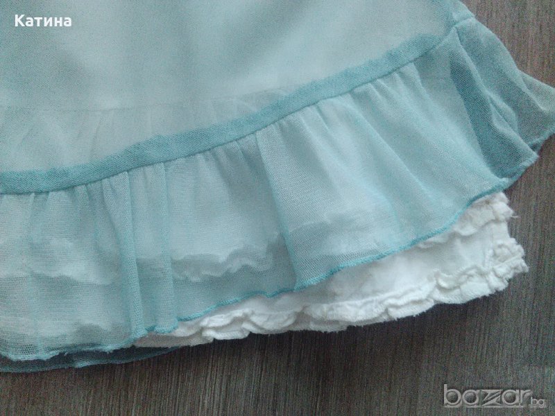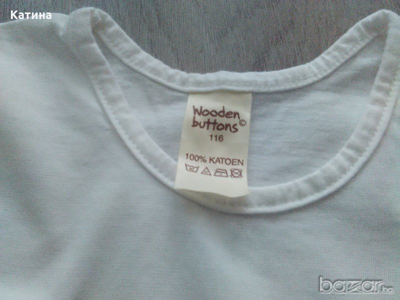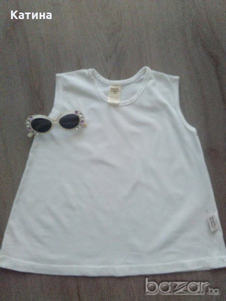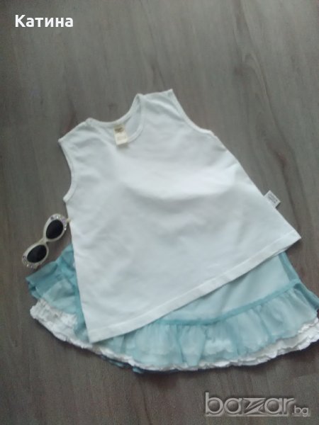 Bonbini сладка двупластова поличка.Горен пласт-синьозелена мрежеста материя,под която прозира бяла памучна подплата.Размер на етикета 116 см.Обличана 2-3 пъти.В отлично състояние.Wooden buttons топ в бяло.Размер на етикета 116 см.Нов,само е изпран.Кокетни слънчеви очила,декорирани с кристалчета в бяло и нежно лилаво.Купувани от магазин с английска стока.Нови,с отстранен етикет.