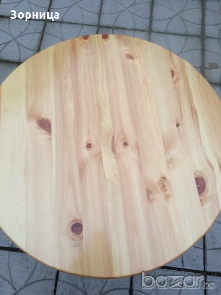 Дървена масичка изработена с от иглолистен материал Размери:височина-52 см,диаметър-69 см.Лакирана с безцветен лак Наличност 8 бр