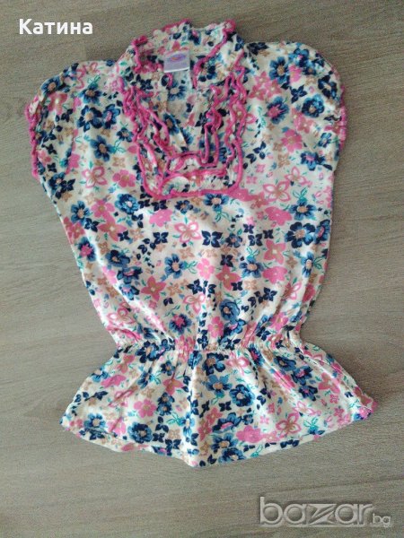 -116см.Много фина материя-100% памук, ластик в талията и на ръкавите.Обличана е веднъж.Като нова.Чантичка от дънкова материя,декорирана с малки бели цветчета.Магнитно закопчаване.Използвана веднъж.Като нова.