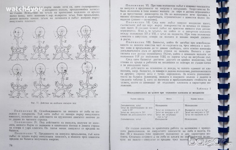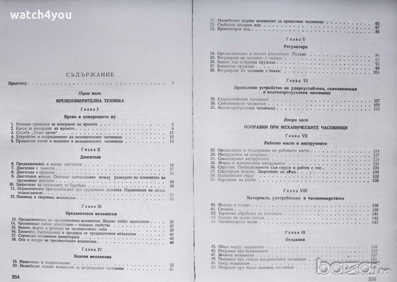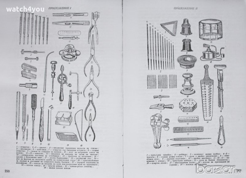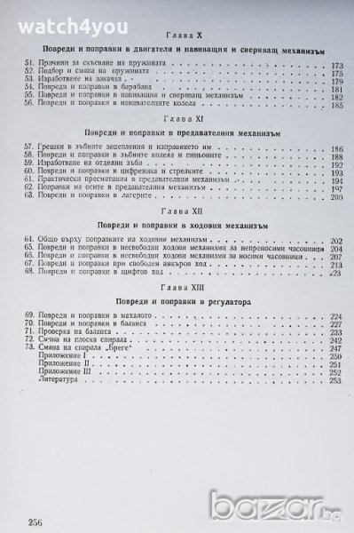 Съдържа всички основни принцип на часовникарството, устройство на инструменти, подробни схеми и фигури за ремонт на механични часовници.
