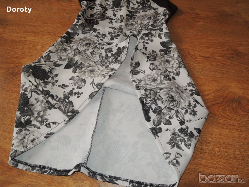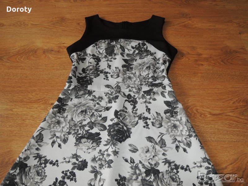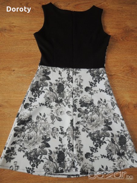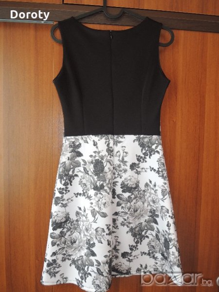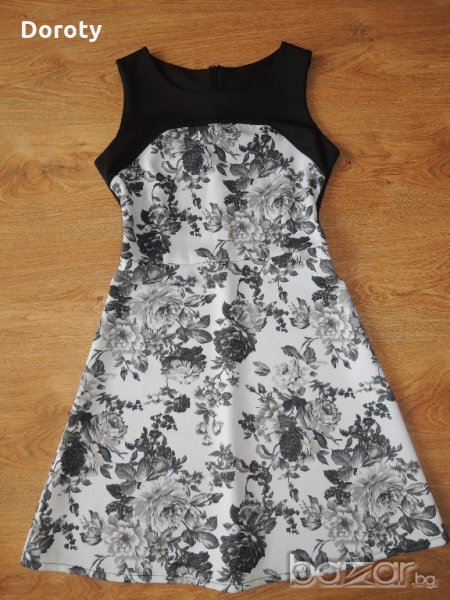 Прекрасна дамска рокля, от плътна еластична материя, подходяща за всеки повод и сезон. Облизана веднъж за повод.Размер S. Дължина-84см, Ширина под мишници- 40см, талия ширина-33см.