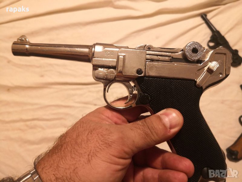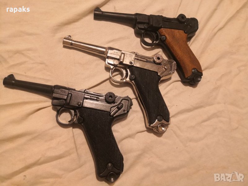 Цената за модела с кафявата ръкохватка е 410, с черната 430, а 450 е никелираният. Дългоцевият Люгер от последните снимки, т. н. Парабелум струва 390 лв.
