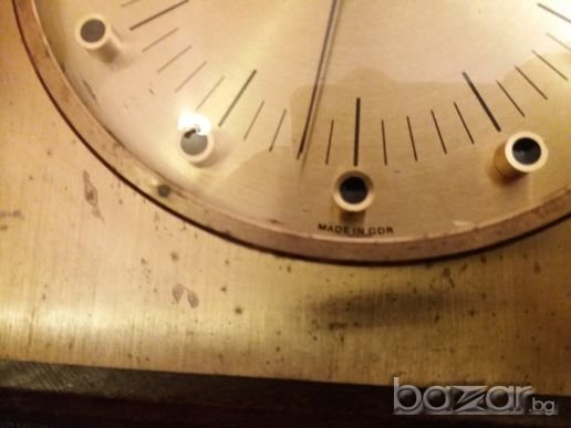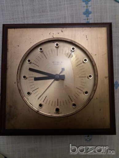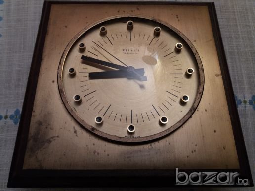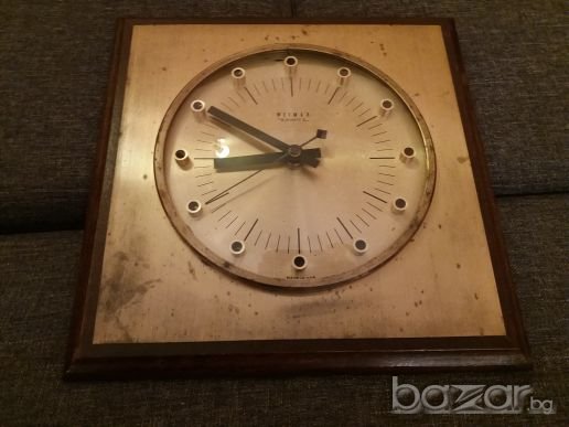Стар стенен електронен часовник WEIMAR ,производство ГДР, месинг и дърво. Часовникът работи много точно, няма забележки освен видимите следи от времето.