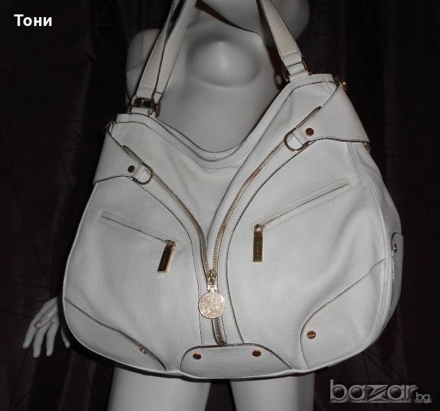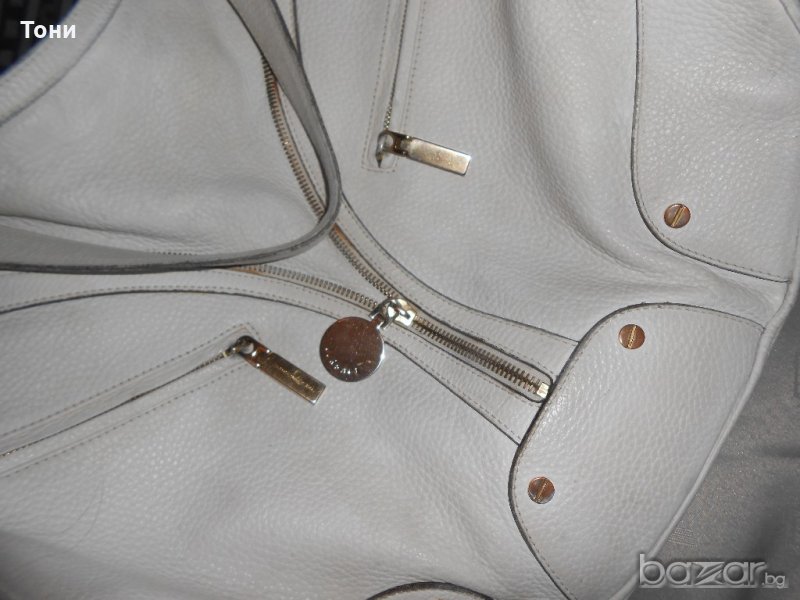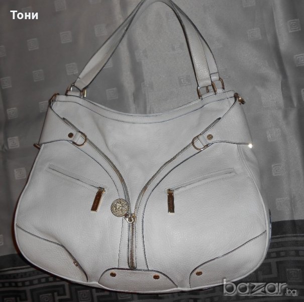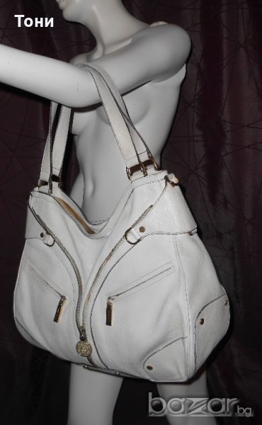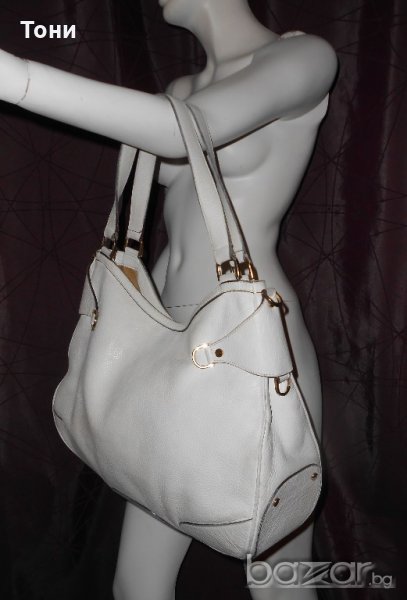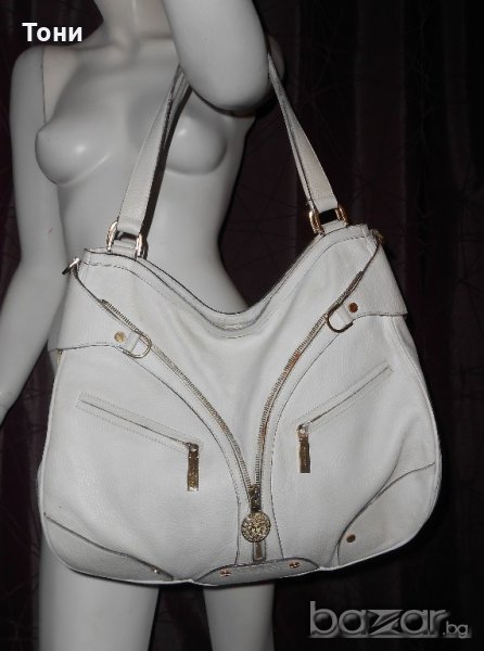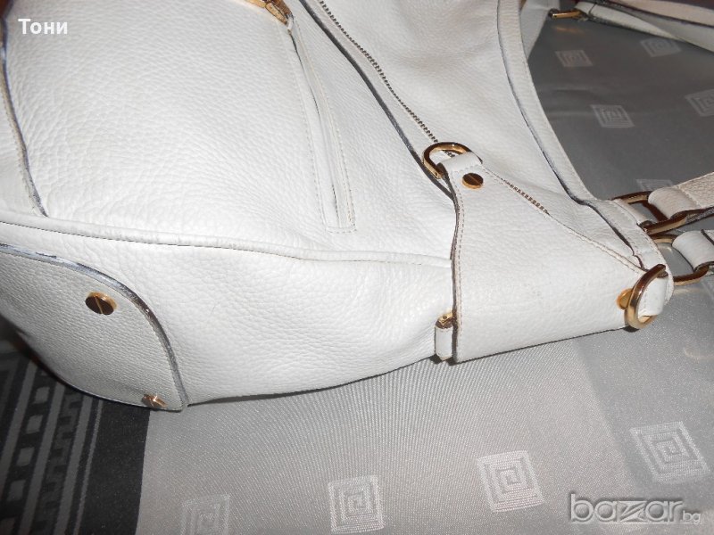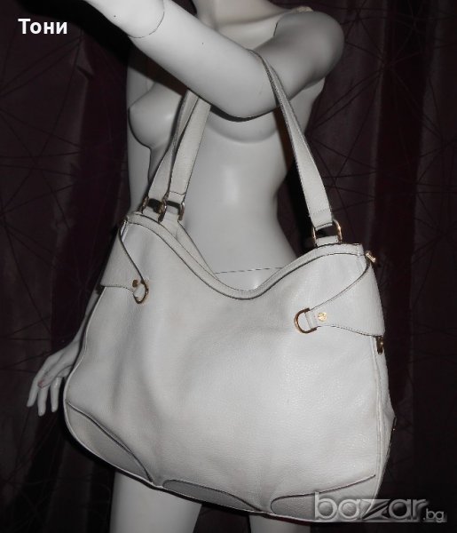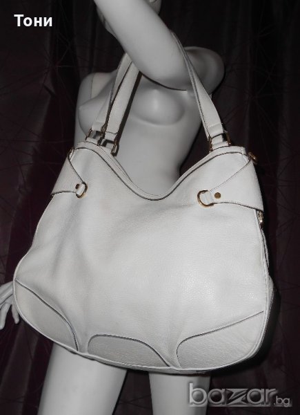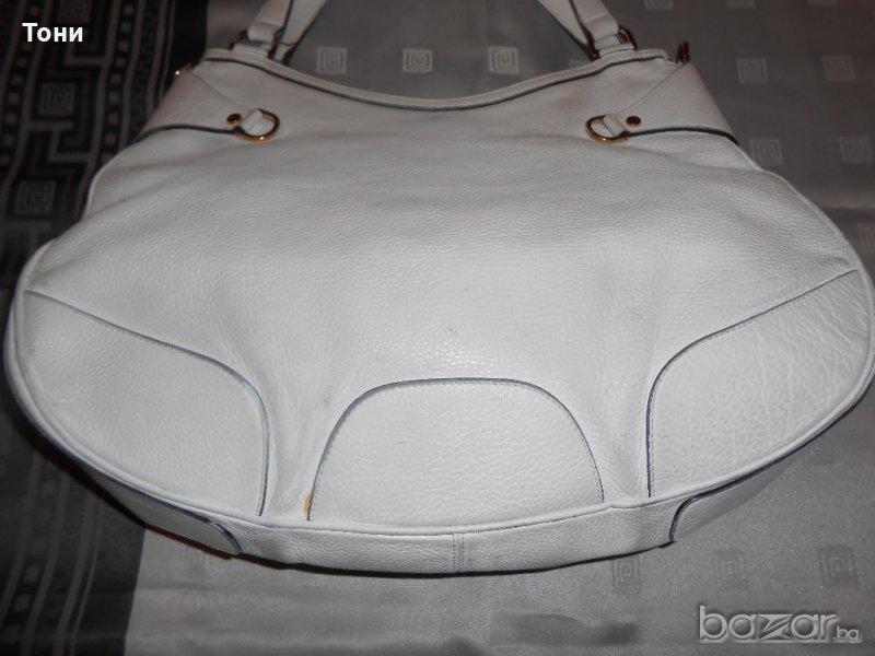 Цвят мръсно бяло .Чантата е носена .Леко захабяване по- самата кожа .Ако се даде за боядисване ще е като нова .По- златните елементи няма изтъркване .