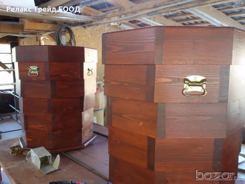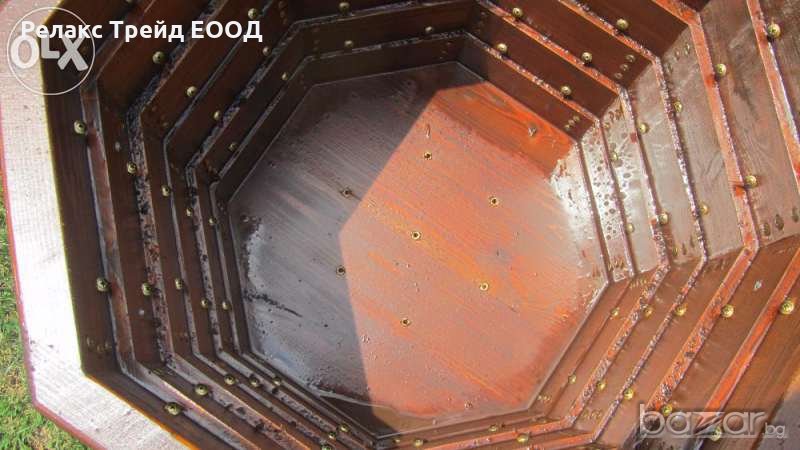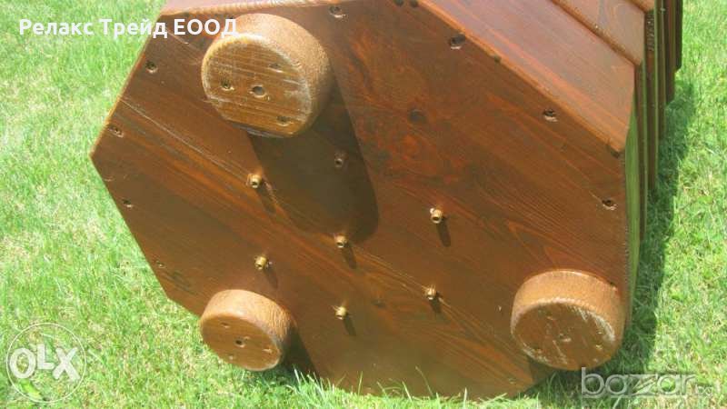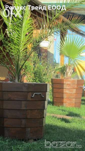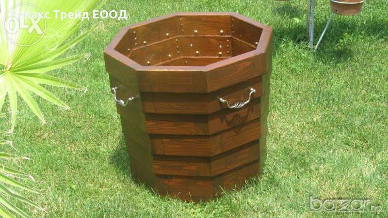 Кашпите са от сушен иглолистен материал с дебелина 25-35 мм. Сглобката е с лепило, дибли и видии. Дървото е импрегнирано срещу паразити. Цвета на байца е по Ваше желание (има снимка с възможните). За финиш се покрива с няколко слоя скъп лак на водна основа (като гумено покритие става). Освен това вътре облицоваме кашпата с дебел найлон. Отворите за изтичане на водата са с набити алуминиеви тръбички, така че водата да не може да има контакт с дървото. Тръбичките са по-дълги от дъното за да не подлизва по тях. На една от снимките се вижда как се капсуловат над найлона. Ако някой се сети за нещо по-здраво от това - да казва! Тези на снимките са с по 3 дръжки. Може и с 2 или с 4. Може да се добавят и колелца за лесно преместване по твърди повърхности.