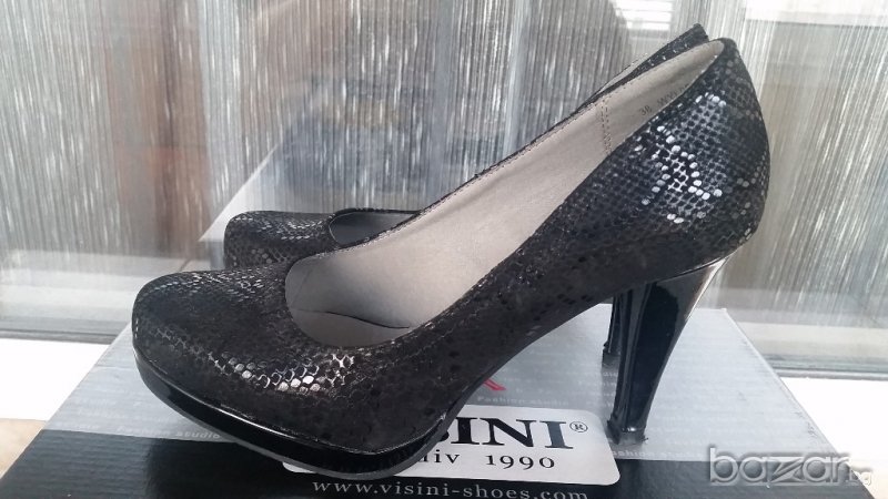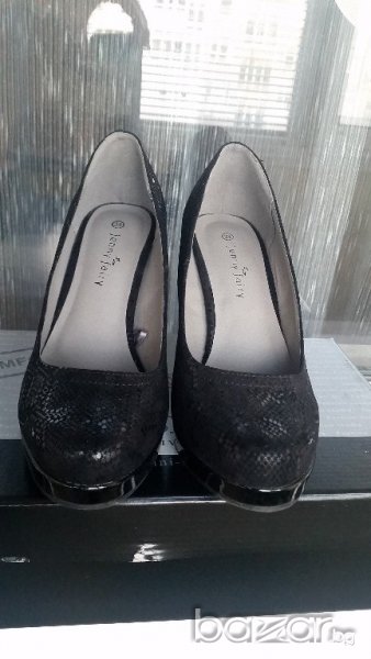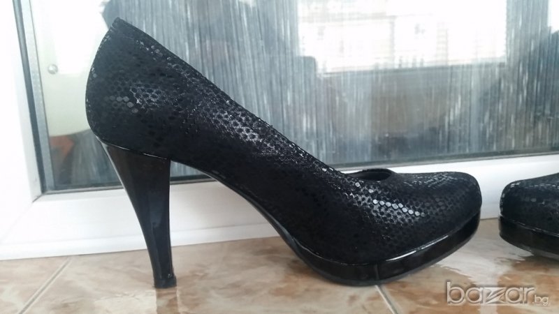 Обувките са в перфектно състояние.Обувани са един път за няколко часа за повод.Височина на тока - 9,5 см.Кожата е имитация на змиййска кожа.Много удобен ток.На платформа са