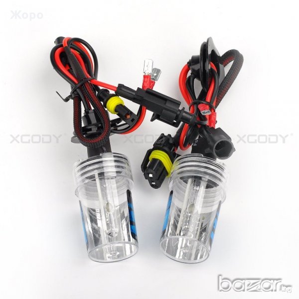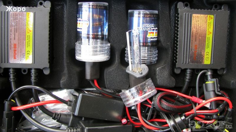 2 биксенонови разглобяеми крушки 35 Вата, 2 тънки баласта DC 35W/12V, реле с кабели, болтове и инструкции за монтаж.