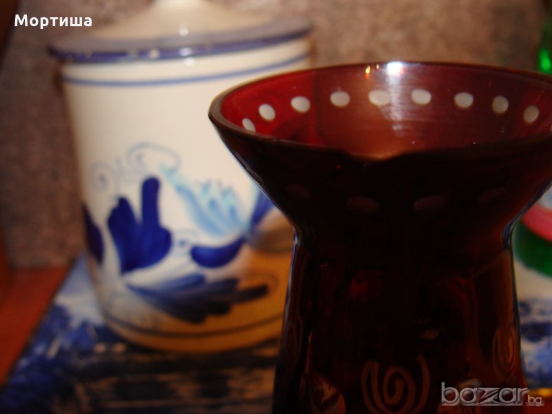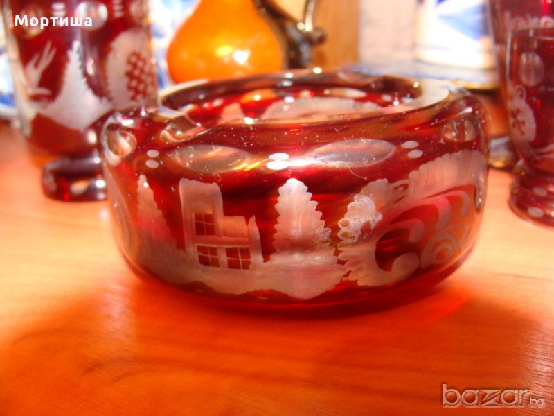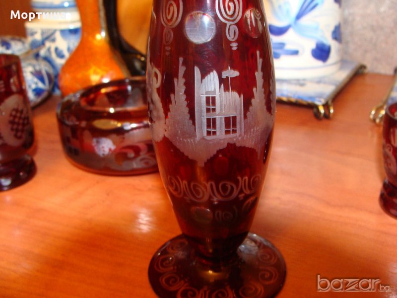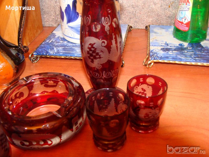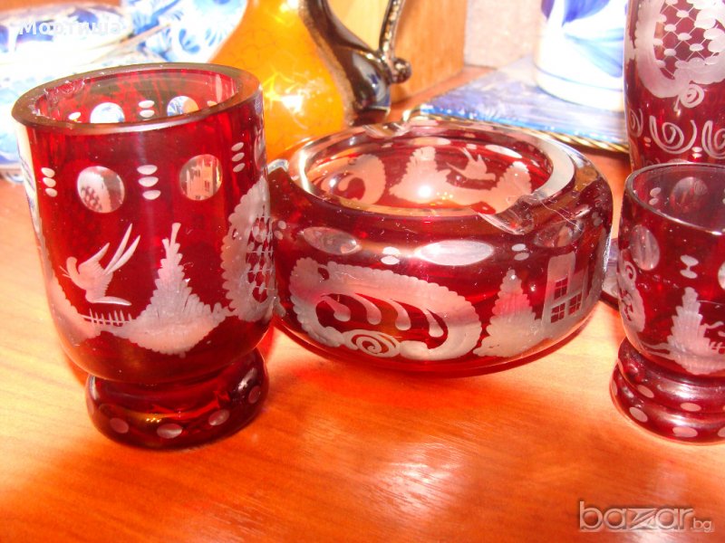 Стар рубинен кристал Ваза вис 15 см ,пепелник диаметър 10 вис 5 см свещник чаша височина 8 см и две малки чашки вис 6 см редки и красиви гравюри Лека фабрична забележка на гърлото на вазата снимана не са използвани освен като декорация За ценители и колекционери Крайна цена без бартери НЕ СЕ ПРОДАВАТ ОТДЕЛНО