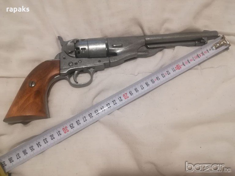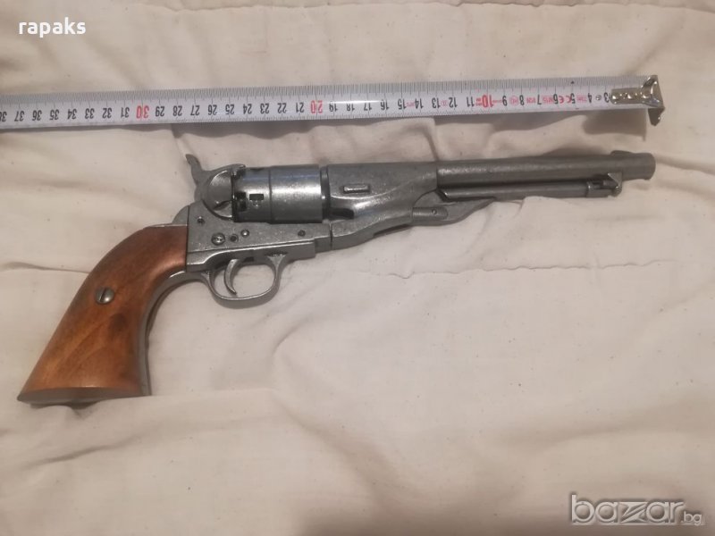 револвер Kolt 1860. Тежи 1120 гр. Зарежда, щрака и превърта. На свободна продажба, ако имате разрешението на тъща и съпруга. Не мога да продавам под себестойността и на глупави и обиждащи мен и продаваният артикул предложения отговарям по желание и с тон по мое лично усмотрение. Имам и други качествени реплики, но за тях цени в другите ми обяви. Цената тук е за револвера от първите 5 снимки.