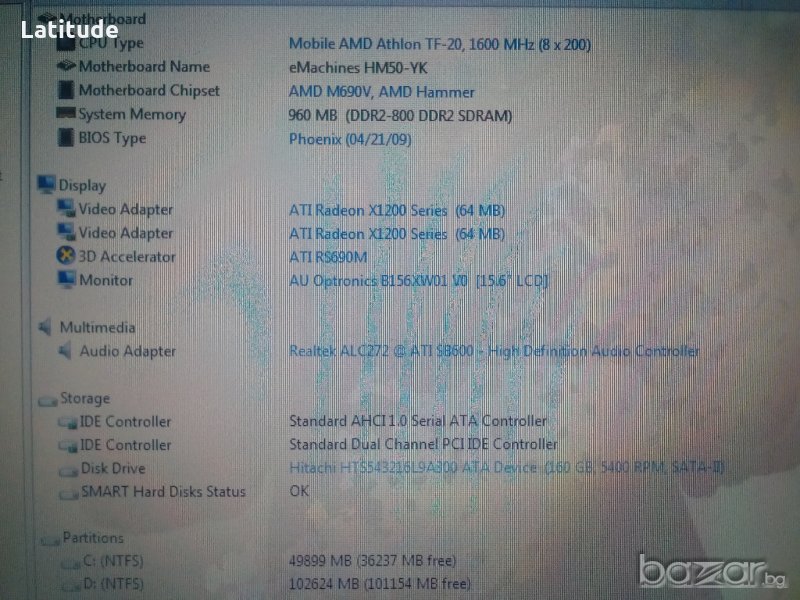 Поставена дънна платка работеща от eMachines G625,хард диск,памет.