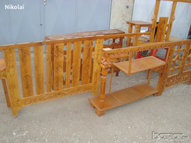 Дърворезби от едно време, могат да се използват за декорация на 4-5 стаи , голяма механа и за каквото се сетите.Състоят се от дърворезби за окрайчване на таван с размер около 4.5 на 3.2метра на първите снимки, розетка с диаметър 100см и една квадратна, етажерки различни видове и размери приблизително 30метра, радиаторни решетки 4 броя ,голям шкаф с дърворезба отстрани и отзад, спалня.