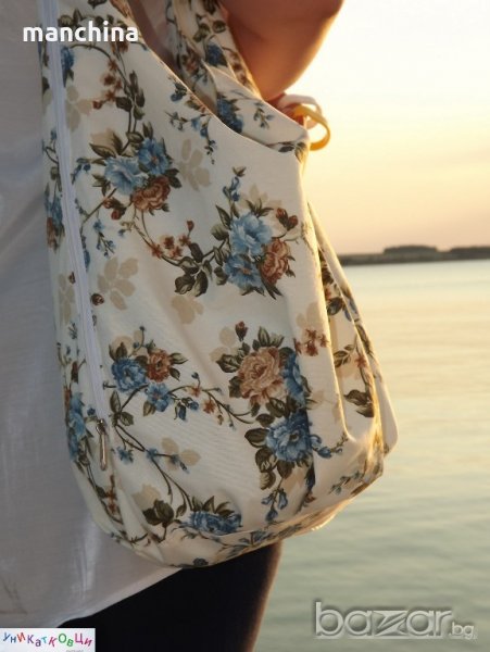 Текстилна дамска чанта, изработена от 100% памучна материя. С една или две дръжки избирате Вие, благодарение на разположения по цялата странична част и дръжката цип. Разполага с три вътрешни джоба и един външен с цип.